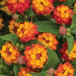 2″ clusters mass on 15–18″ mounding plants, with a glowing color spectrum of deep-red through orange to bright-yellow. No unsightly seed pods…this is a sterile variety so it will not go to seed like other Lantana. Flourishes in the heat, tolerates drought, attracts pollinators, and puts off nibbling deer. Sun.